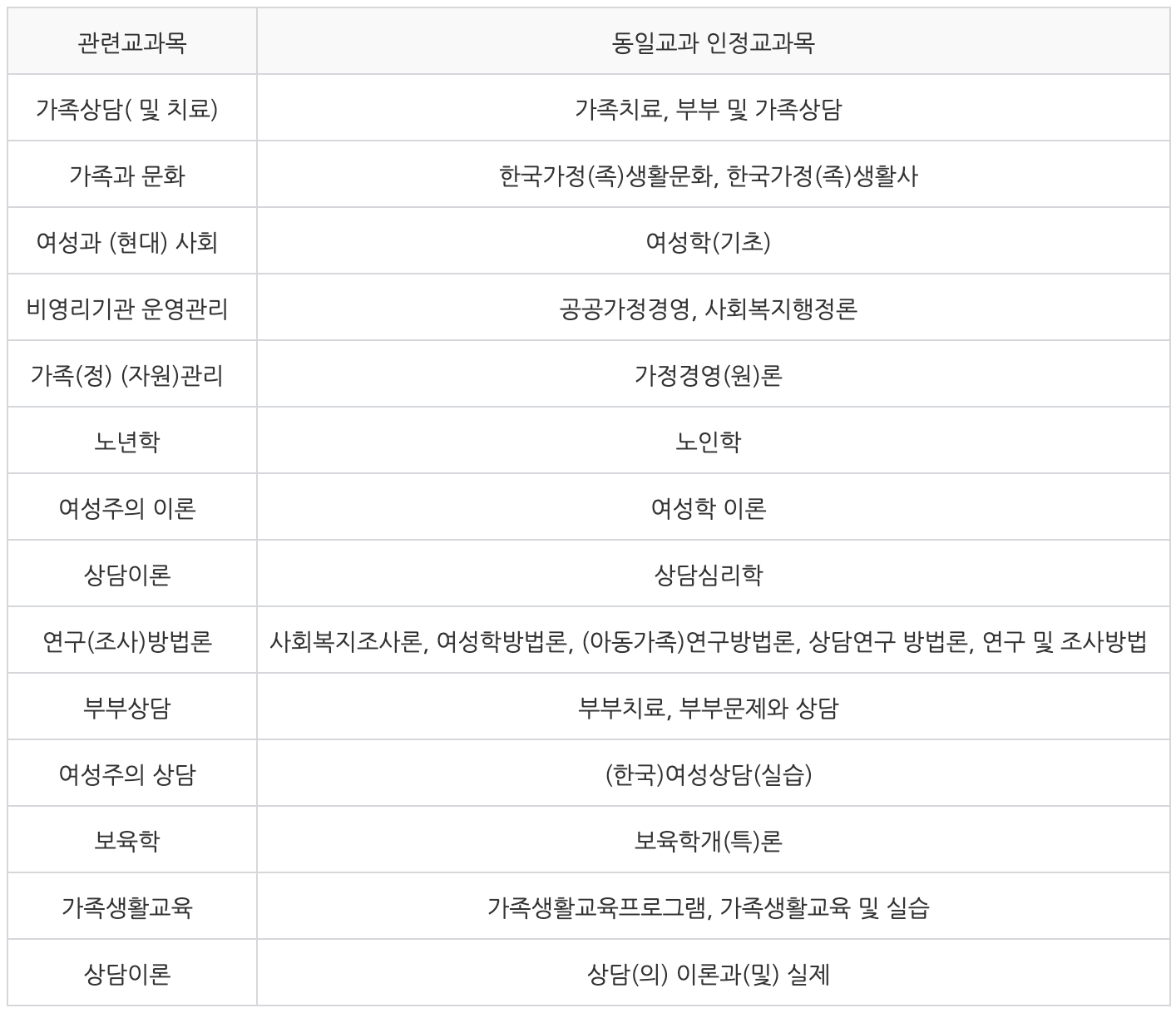 4) 건강가정사 동일교과목으로 인정되는 교과목
