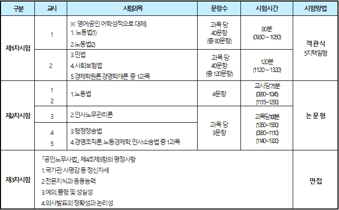 ③ 대부분의 전문자격사 시험은 1차와 2차 필기시험만으로 합격자를 결정하고 있으나, 공인노무사 시험은 유일하게 면접시험을 유지하고 있습니다.
