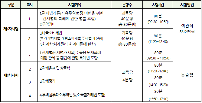 ② 관세사는 무역영어 시험과목이 있으므로 공인회계사와 세무사의 경우와 같이 공인영어시험성적을 요구하지 않습니다. 또한 , 공인회계사의 일정한 학점이수 조건도 요구하지 않습니다.