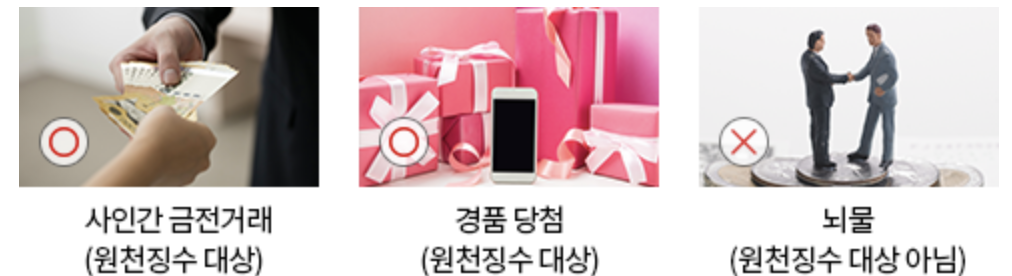 [사례] 사인간 금전거래시에는 이자소득 원천징수, 경품 당첨금 지급 시에는 기타 소득 원천징수 대상에 해당이 되며, 뇌물과 같은 경우에는 기타 소득에는 해당이 되나 원천징수 대상에는 해당되지 않음. 출처:국세청