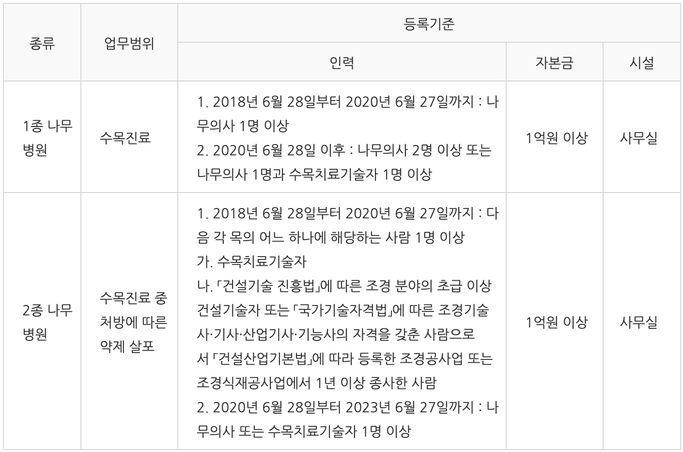 ➁ 나무병원의 종류별 등록기준 (산림보호법시행령 제12조의 9 제1항 관련)