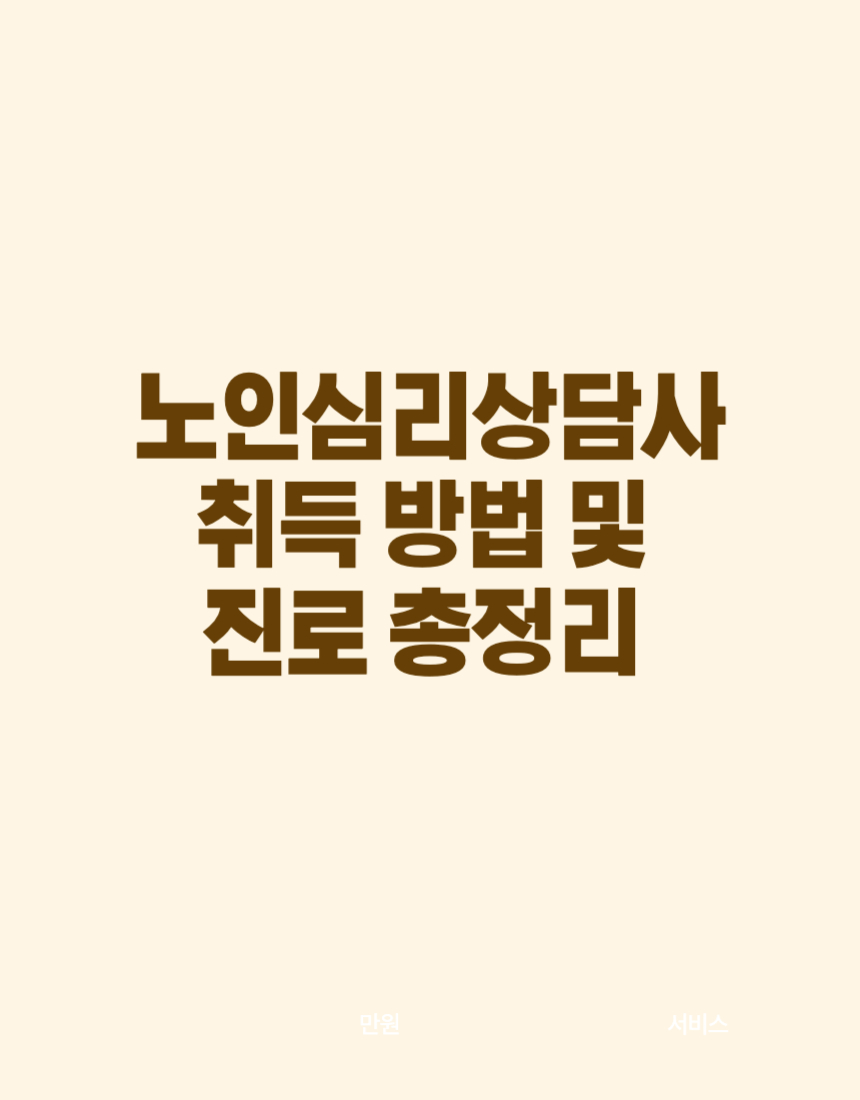 '노인심리상담사'는 노인 계층을 대상으로 노인의 정신적 안정과 사회 적응, 질병이나 위험에서의 보호, 평생교육, 종합적인 문제 해결 등을 위해 전문적 상담과 관리를 제공하는 직업입니다. 주로 노인복지관•노인그룹홈•실버타운•유료 양로원•요양보호시설 등 노인 건강과 관련된 시설 및 노인 교실 등에서 근무하며, 이를 위해서는 노인심리상담사 자격증을 필수로 취득해야 합니다.