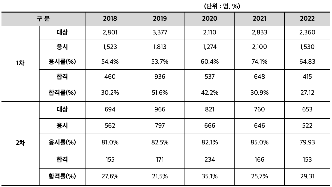 ※ 1차 시험 : 100점 만점 기준 과목당 40점 이상, 전 과목 평균 60점 이상