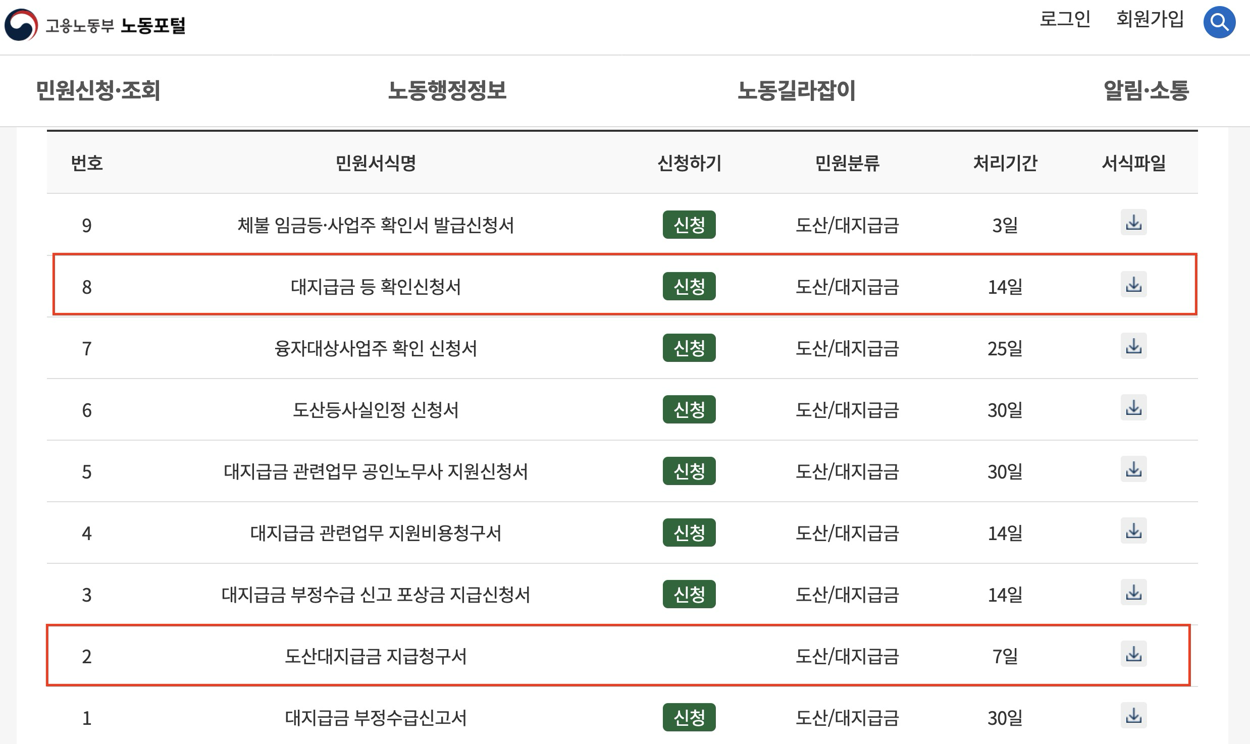 ※ 고용노동부 홈페이지에 도산대지급금 지급청구서, 대지급금 확인신청서 양식을 다운받아 우편 또는 방문 접수하셔도 되고, 바로 신청 누르고 접수하셔도 됩니다.