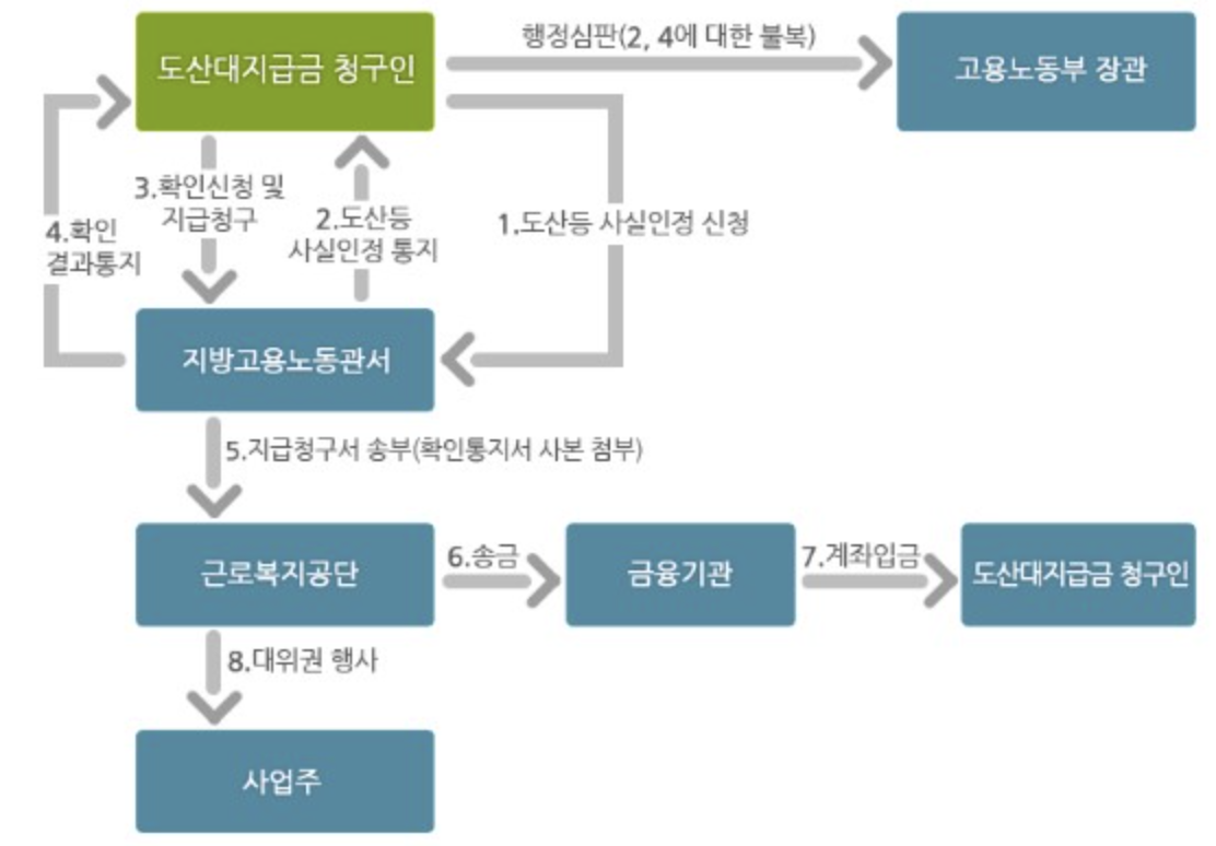 - 필요 서류 제출 : 근로계약서, 임금 미지급 내역, 도산 증빙 서류 등