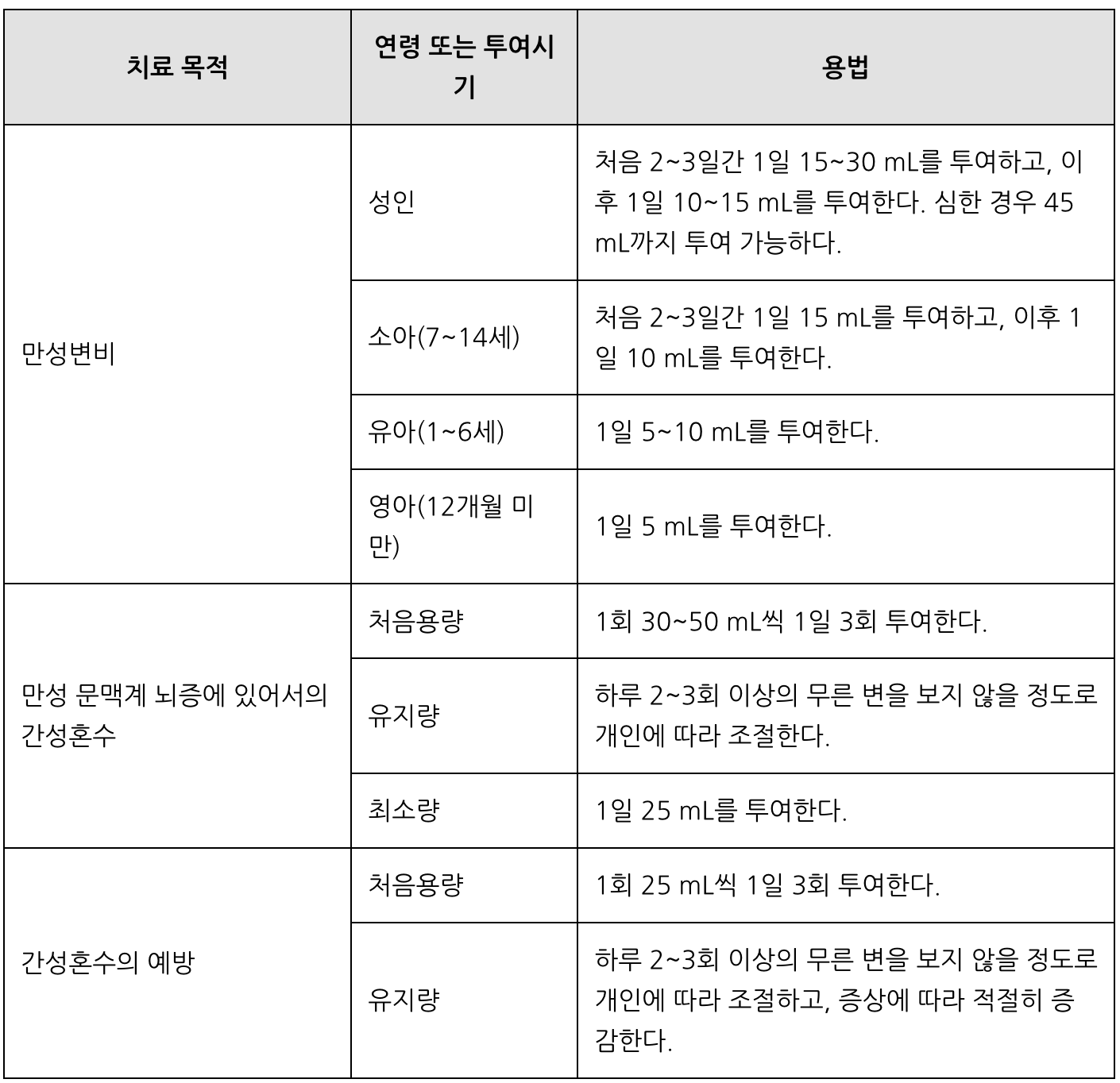 의사의 처방 없이 구입 가능한 일반의약품으로서는 만성변비, 영유아 및 소아의 변비, 분만 후의 변비 치료에 사용됩니다. 의사의 처방 하에 사용되는 전문의약품으로써는 *만성 문맥계뇌증에서 간성혼수의 치료 및 예방에 사용됩니다. 일반의약품 단일제 제품으로 듀파락이지 등이 있고, 전문의약품 단일제 제품으로는 듀파락 등이 있습니다.