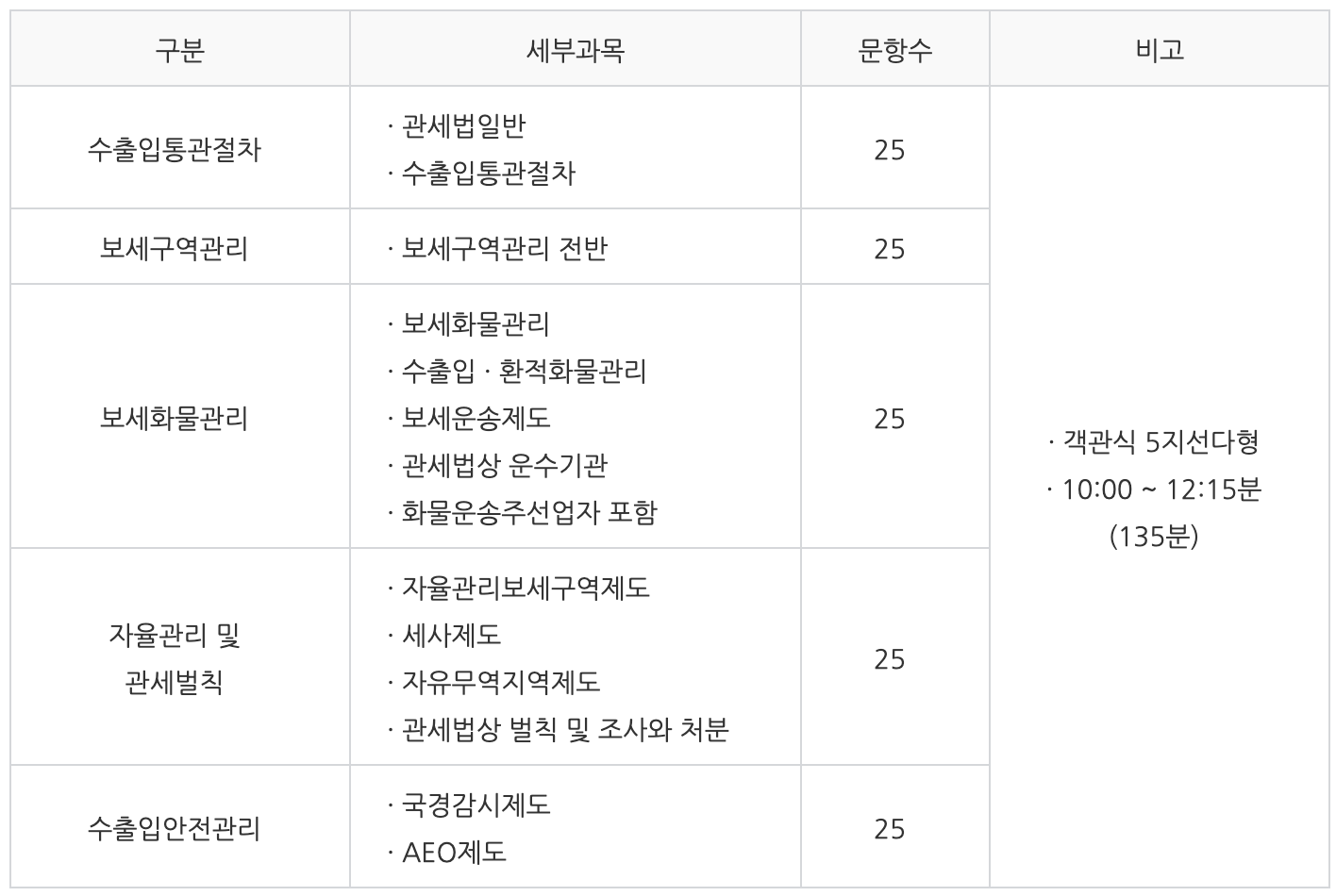 ➁ 과거에는 일반직공무원 5년 이상의 경력이나 보세화물 관리 업무 관련 3년 이상의 경력이 있는 사람만 응시할 수 있었으나, 2014년부터 응시자격제한이 폐지되어 누구나 시험에 응시할 수 있습니다.