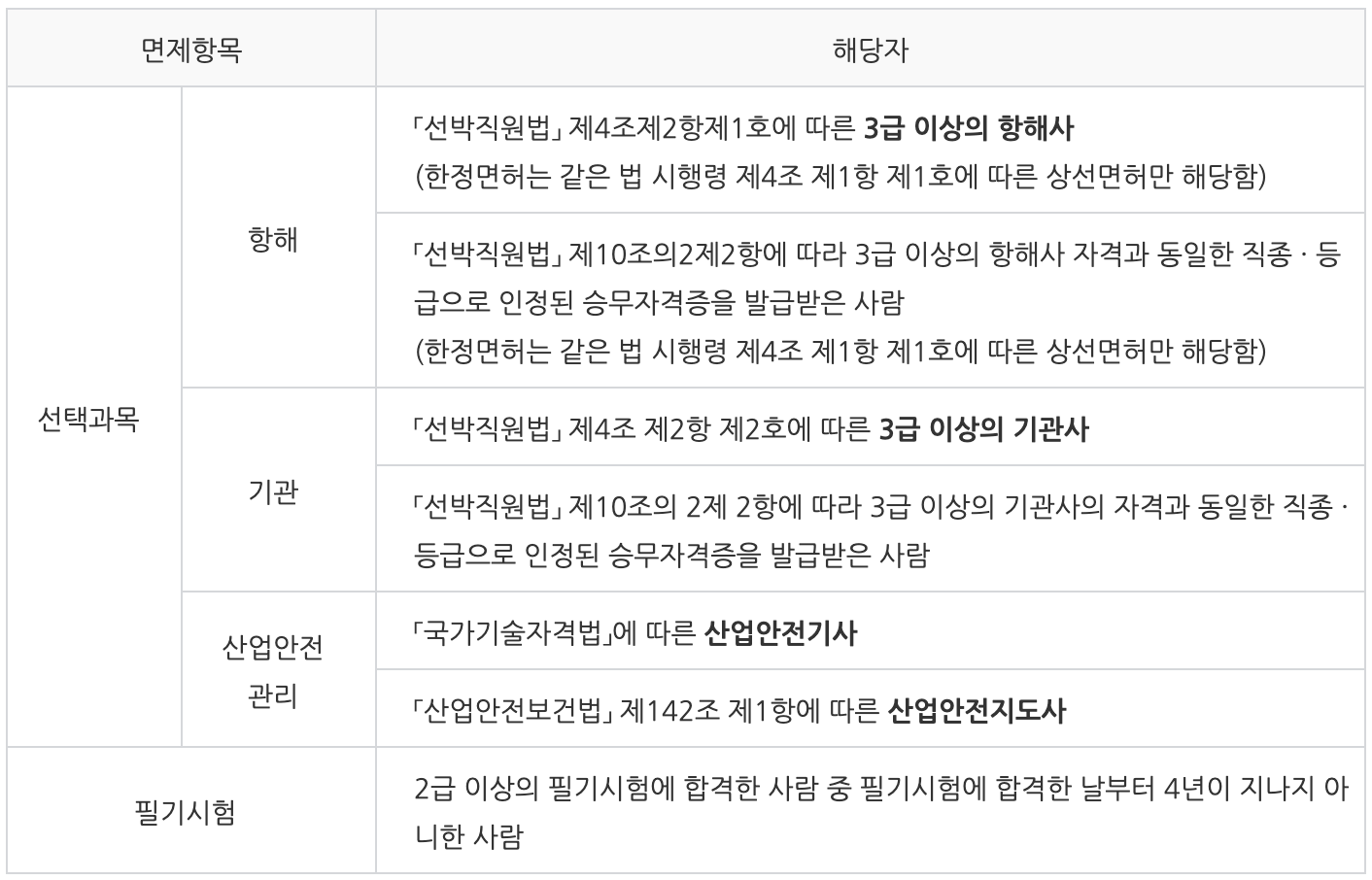 ➀ 산업안전기사 : 산업안전기사가 선박안전관리사 자격시험에 응시하는 경우 선택과목인 산업안전관리과목을 면제 받을 수 있습니다.