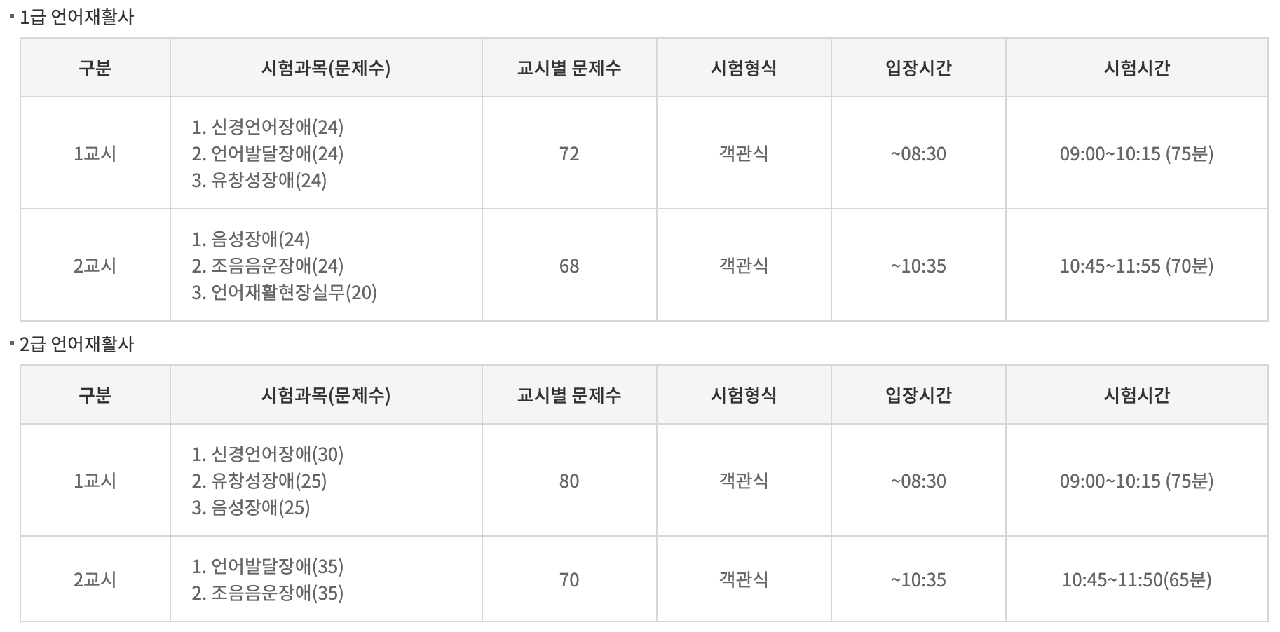 ➁ 언어재활사 자격은 1급 언어재활사, 2급 언어재활사 2개의 등급으로 나누어지고 등급별 응시자격과 시험과목이 다릅니다.