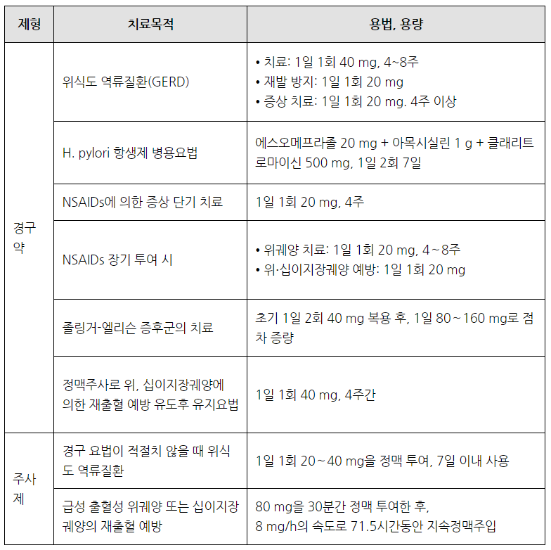 1) 경구약은 위식도 역류질환, NSAIDs 투여로 인한 위장 증상의 단기 치료와 장기간 NSAIDs를 복용하는 환자의 위/십이지궤양 치료와 예방, *졸링거-엘리슨 증후군의 치료 등에 사용됩니다. H. pylori에 감염된 십이지장 궤양의 치료에 항생제와 함께 사용됩니다.