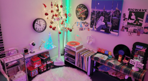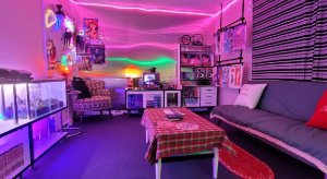 레트로 빈티지 무드의 특색 있는 방입니다. LED , RGB 조명들을 이용해 세련되고 도회적인 느낌을 표현한 팔월의 시티팝 룸입니다.