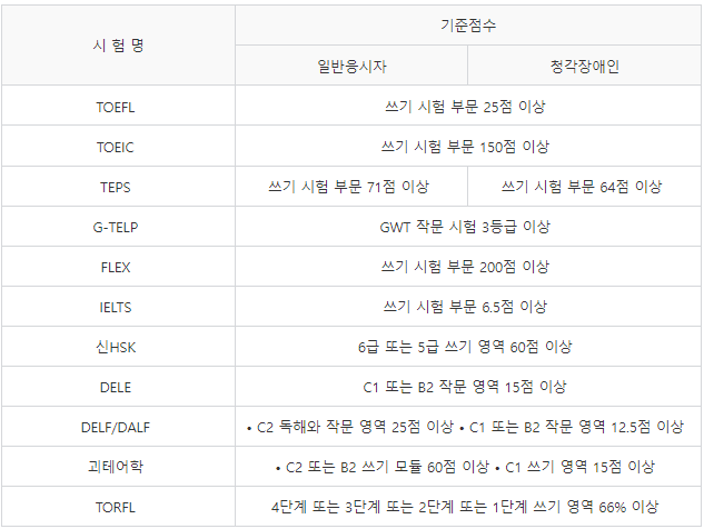 ※ 외국어번역행정사의 '해당 외국어'는 '영어, 일어, 중국어, 스페인어, 프랑스어, 독일어, 러시아어'이며 제2차 시험 원서접수 마감일 전 2년 이내에 실시된 외국어능력검정시험으로 대체함 (행정사법 시행령 제9조 제3항)