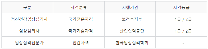 심리상담 민간 자격 - 한국심리학회 : 일반 심리사 - 한국상담학회 : 전문상담사 - 한국상담심리학회 : 상담심리사 - 한국임상심리학회 : 임상심리전문가 심리상담 국가 자격 - 국가기술자격 : 임