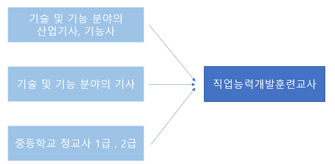 - 기술 , 기능 분야의 기사 자격증을 취득한 후 고용노동부장관이 정하여 고시하는 직종 분야 중 해당 자격 분야와 관련된 직종분야에서 1년 이상의 교육훈련경력 또는 실무경력이 있는 사람으로서 고용노동부령으로 정하는 훈련을 받은 사람