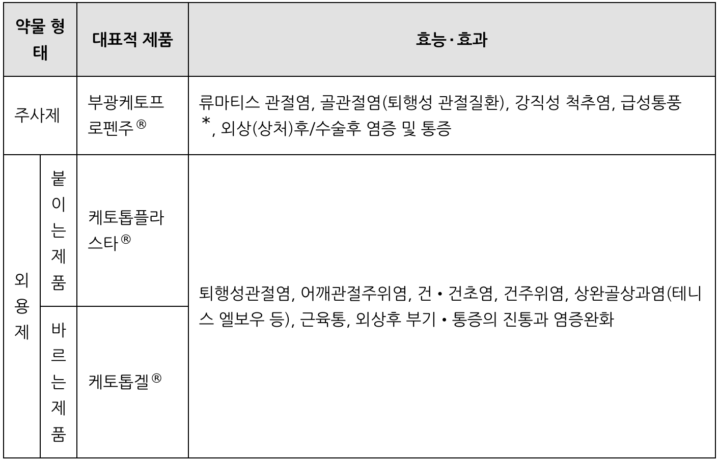 성인의 통증과 염증을 완화합니다. 현재 국내에서는 크게 주사제와 외용제 두 가지 형태의 약물이 시판되고 있으며, 제형에 따른 대표적인 제품과 효과는 다음과 같습니다.