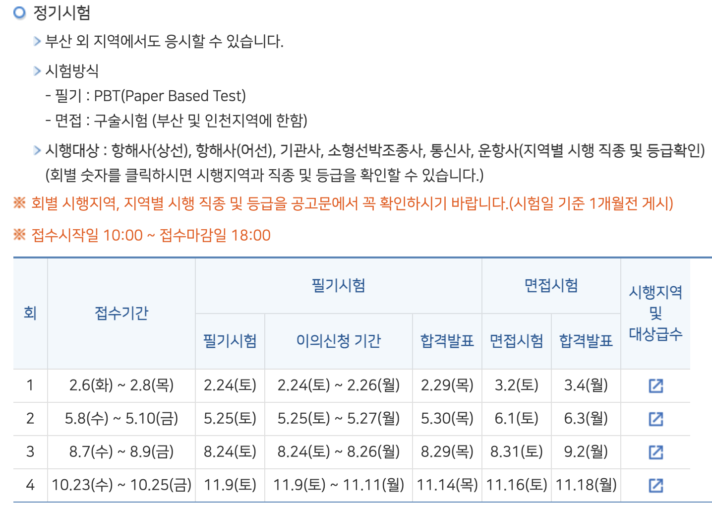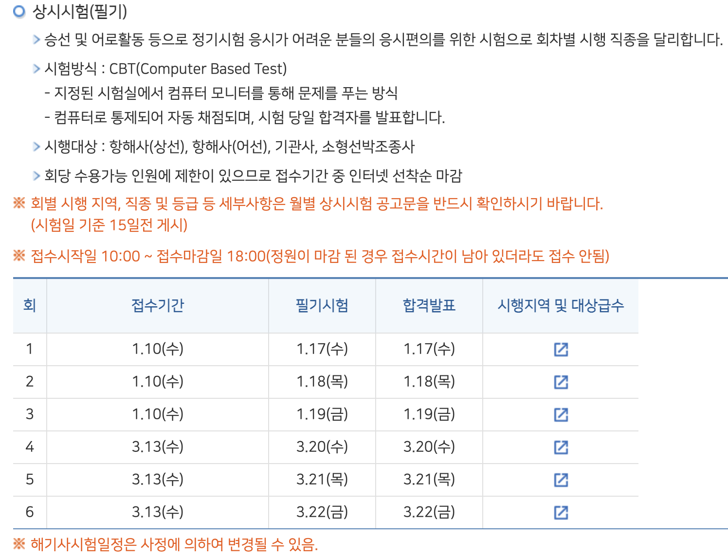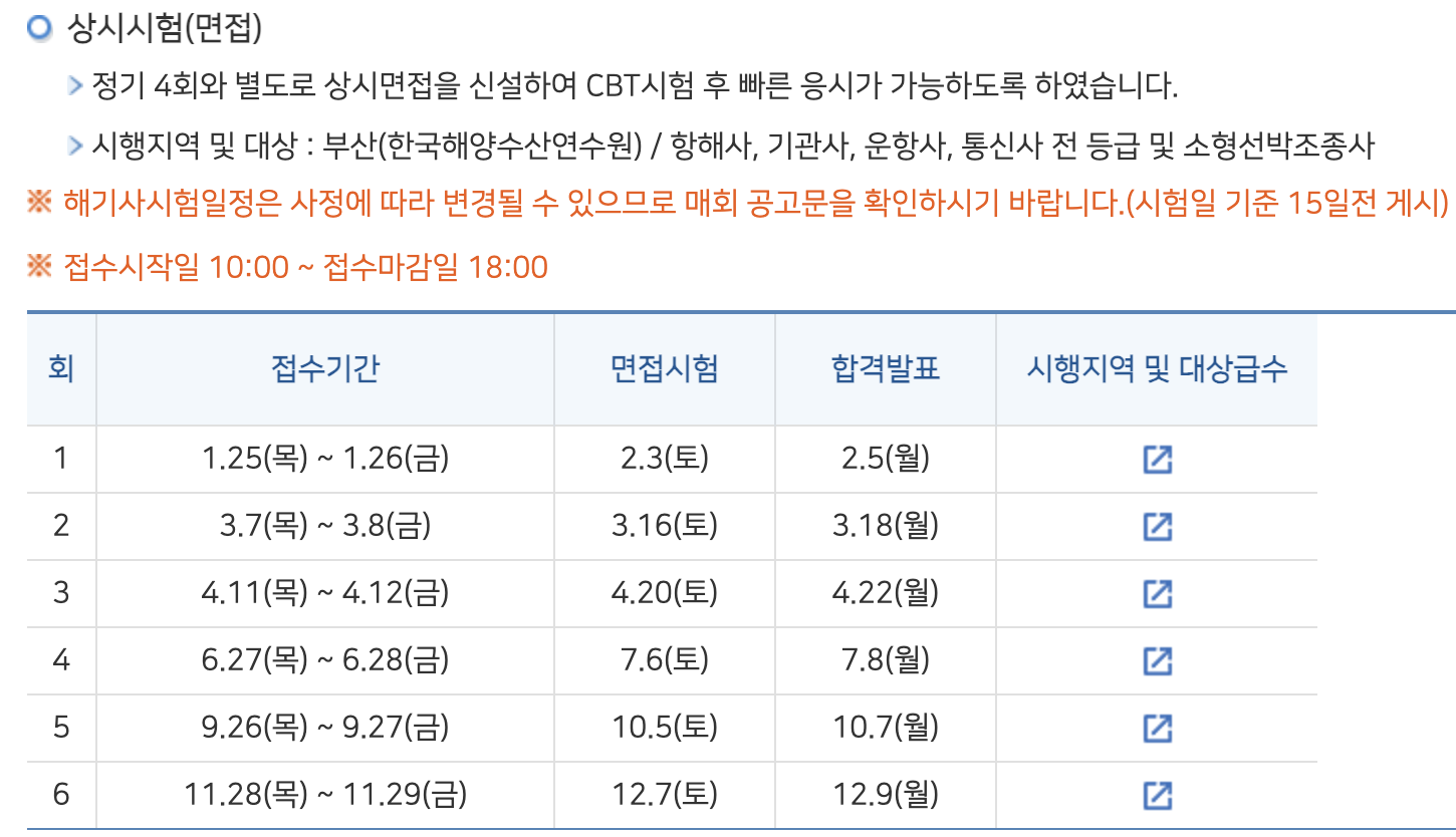 ➄ 해기사 시험은 해양수산부장관이 해양수산부령이 정하는 바에 의하여 정기시험, 임시시험, 상시시험으로 구분하여 시행하고 있습니다. (동법시행령 제10조)
