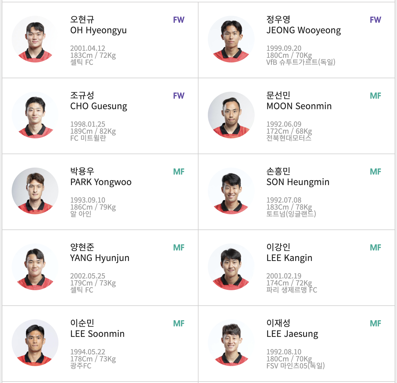 2. 대한민국 대표팀 명단