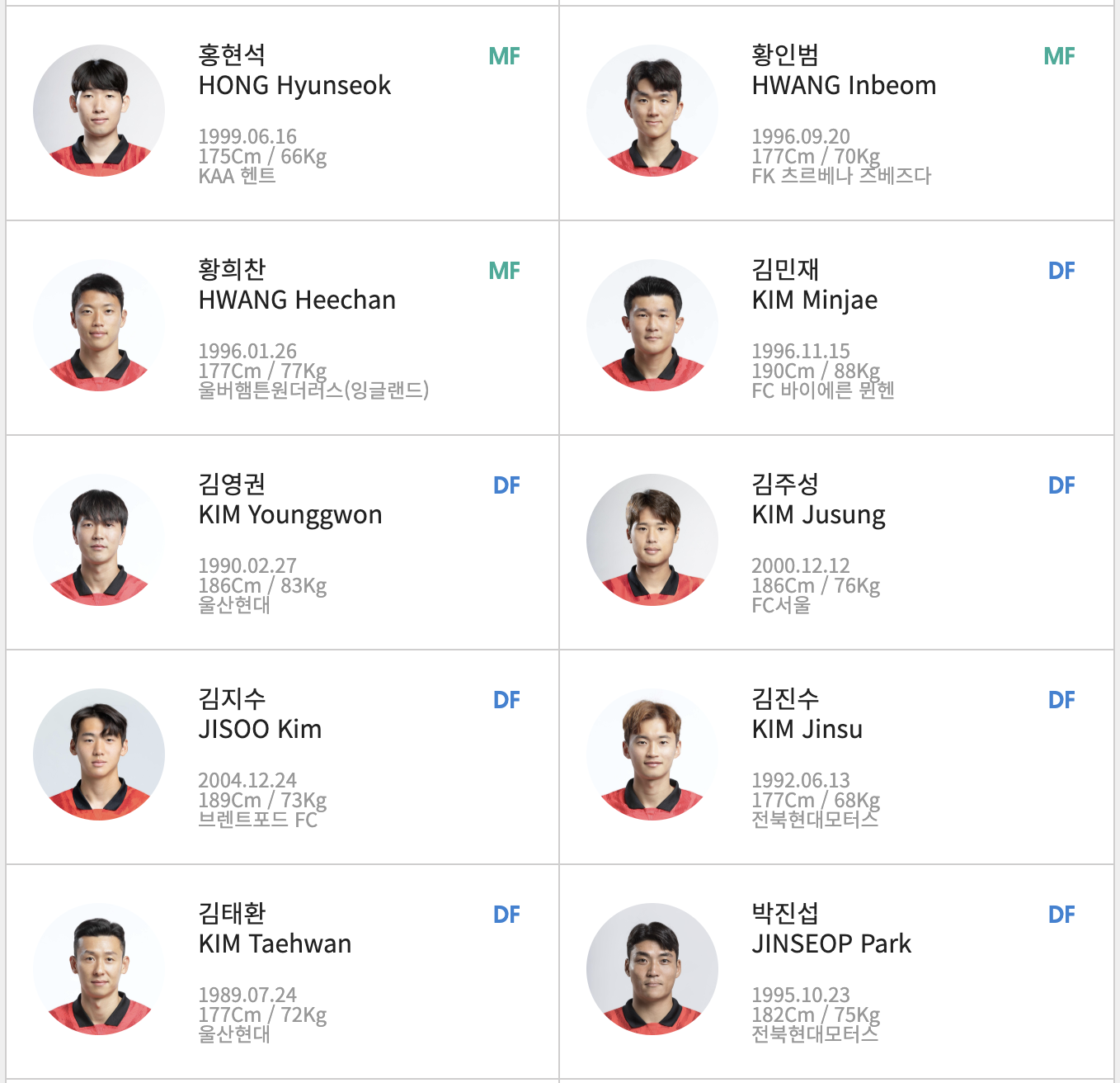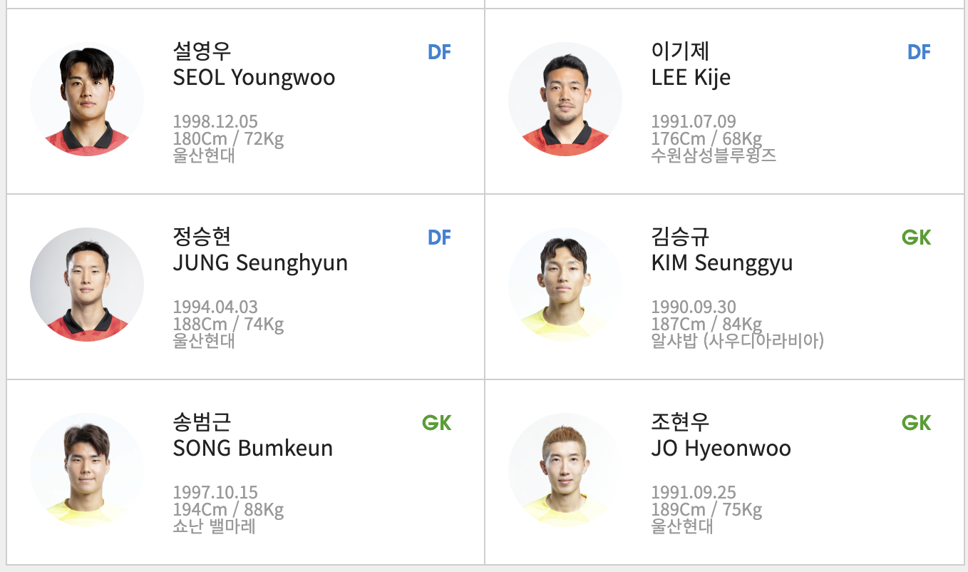 2. 대한민국 대표팀 명단