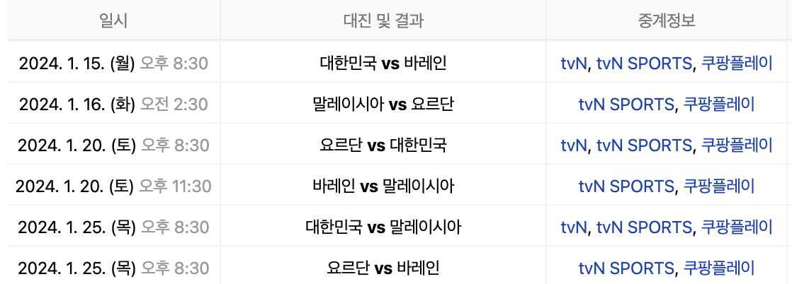 4. 대한민국 E조 경기 일정
