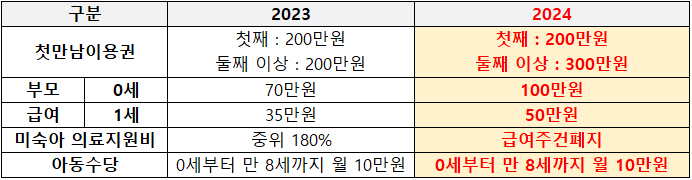 2023년 8월 29일 정부는 2024년 예산안 중 저출산 5대 핵심과제인 돌봄·교육, 일 · 육아 병행, 주거, 양육비용 부담 경감, 건강 등의 문제를 신규 · 보완한 정책에 대한 예산안으로 15조 4천억 추가 투입을 발표했습니다.
