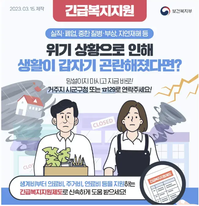 생계비, 의료비, 주거비, 연료비 등을 지원해 주는 긴급복지지원제도로 신속하게 도움 받으세요!