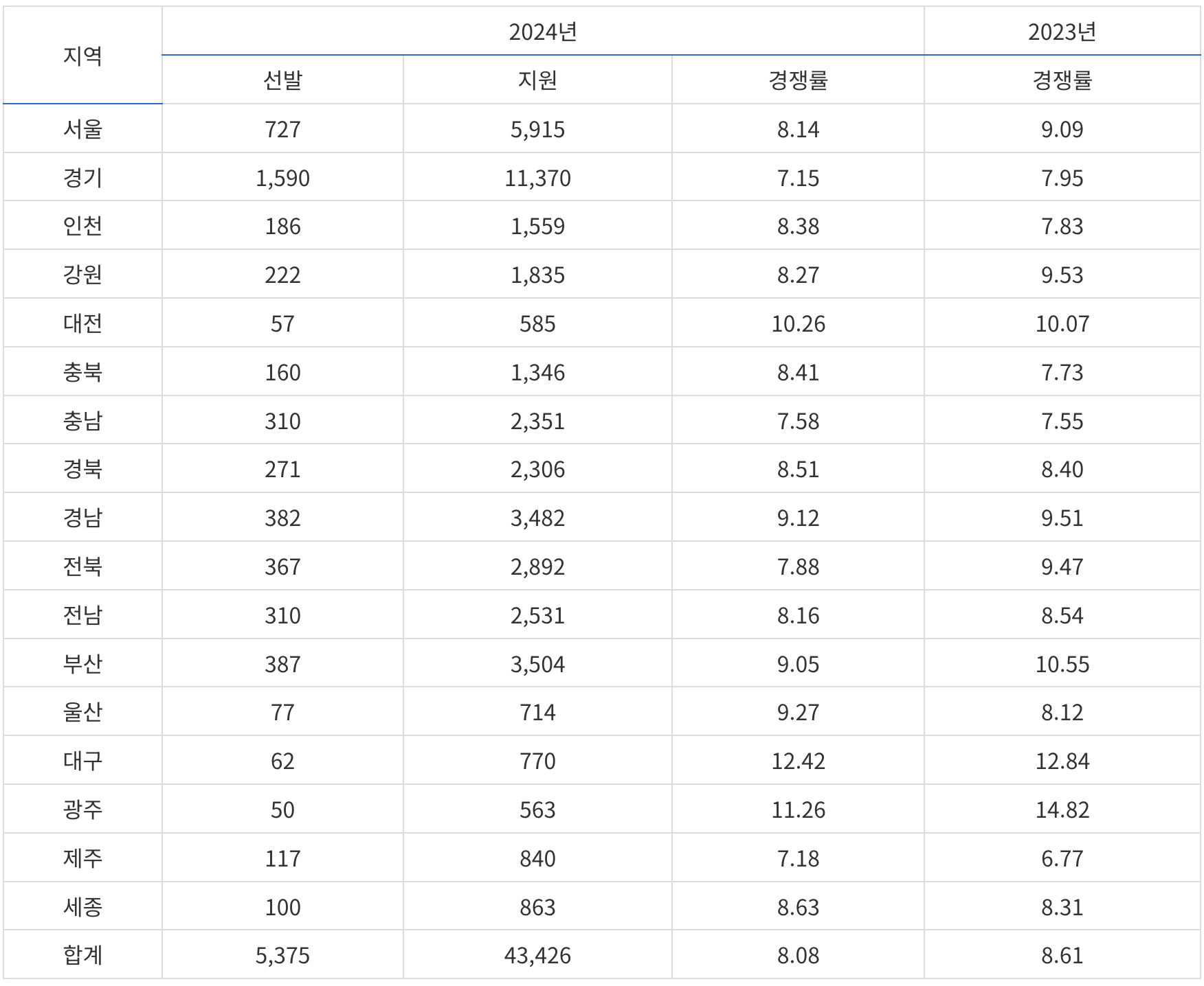 2024년 일반모집 : 1,590명 선발하는데 11,370명 지원 ➝ 7.15 : 1 경쟁률 기록